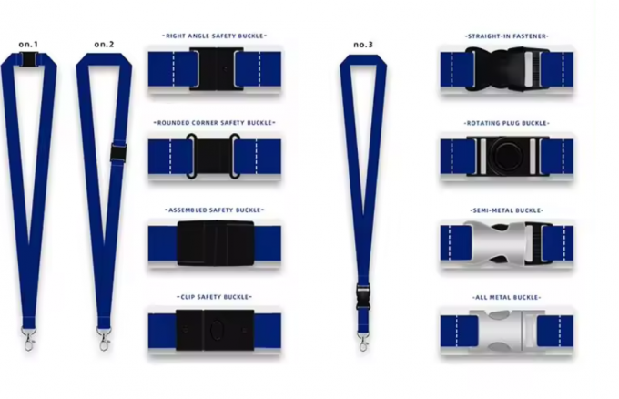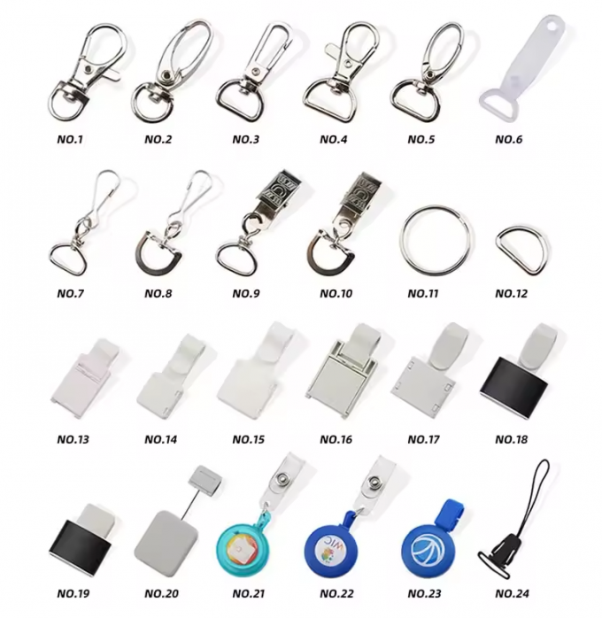 Accessories option for custom polyester lanyards : different metal hooks and clips and some plastic buckles and clips for choice.